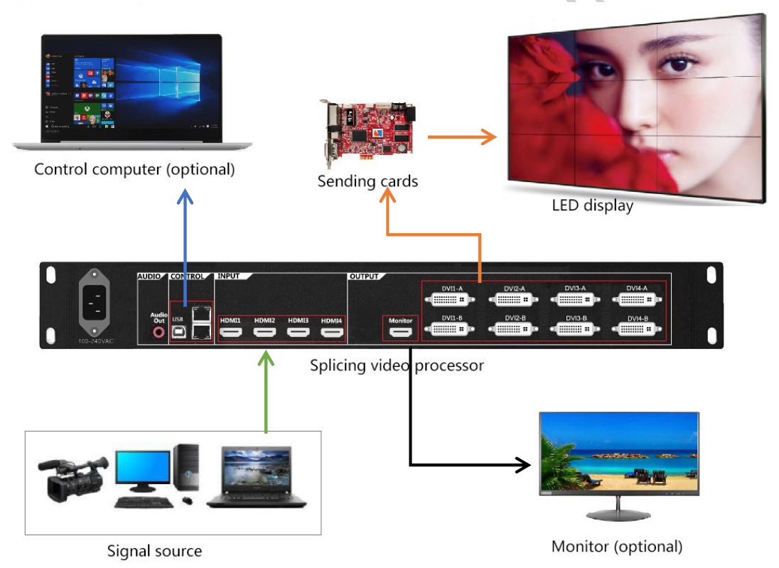 - Hỗ trợ đầu vào độ phân giải siêu cao 4 * HDMI 4K tại cùng một thời điểm, có thể nhận ra các màn hình to để hiển thị chính xác điểm ảnh.