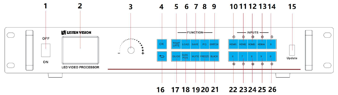 | 9 | Nút "SWITCH": Lựa chọn cửa sổ. Sau đó nhấn vào Nút "HDMI1", "HDMI2", "HDMI3", "HDMI4" để chuyển tín hiệu. |