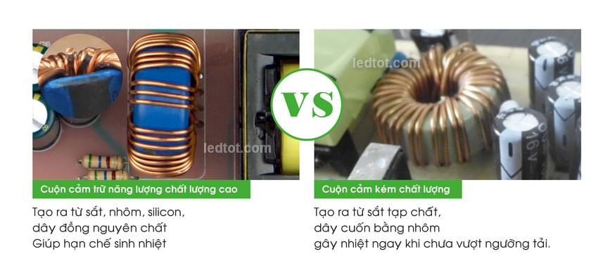 Cuộn cảm của nguồn thường được tạo ra từ sắt tạp chất dễ gây nhiệt ngay khi chưa vượt ngưỡng tải, trong khi cuộn cảm của nguồn tốt được tạo ra từ sắt, nhôm, silicon, dây đồng nguyên chất, giúp hạn chế sinh nhiệt.