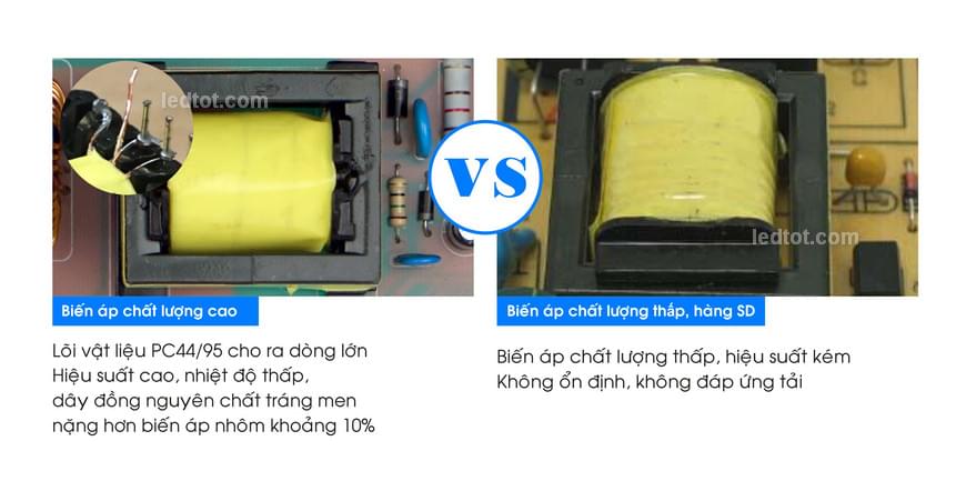 Đối với nguồn tốt, biến áp chất lượng cao hơn hàng nguồn thường. Lõi vật liệu PC44/95 cho ra dòng lớn, hiệu suất cao, nhiệt độ thấp. Dây đồng nguyên chất tráng men nặng hơn biến áp nhôm khoảng 10%.